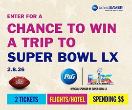 P&G brandSAVER์์ ์ญ์ฌ์ ๊ฐ์ฅ ํฐ ๊ท๋ชจ์ ์ด๋ํ ์ด๋ฒคํธ๋ฅผ ์งํํฉ๋๋ค! ๋น์ฒจ๋์๋ ๋ถ๊ป๋ 2์ 8์ผ ์ฐํํด๋ผ๋ผ(Santa Clara)์์ ์ด๋ฆฌ๋ ์ํผ๋ณผ LX(60ํ) ๊ฒฝ๊ธฐ๋ฅผ ์ง์ ๊ด๋ํ ์ ์๋ ์์ฒญ๋ ํํ์ ๋๋ฆฝ๋๋ค.