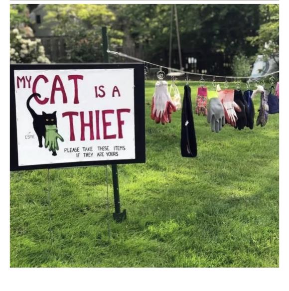 오리건주의 한 고양이 주인은 고양이가 훔쳐간 물건들을 이웃들이 찾아가도록 알리는 표지판을 세워야 했습니다